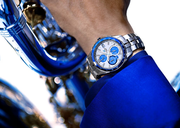 海を感じる爽やかでスポーティなカラーをデザインで取り込みました。メインダイアルに美しいホワイトを、インダイアル部に透過性のあるブルー蒸着を採用。ベゼル上のサファイアガラスにもブルー蒸着を施しています。