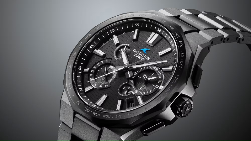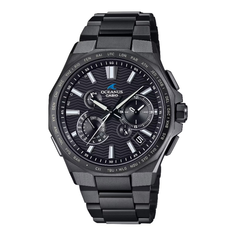 バンドは幅広の中駒を外駒より高く配置することで際立たせ、ソリッド感と腕馴染みを考えて設計しました。さらに、ブラックカラーの文字板には、OCEANUSが着想の源にしている海の波をパターンに採用しています。