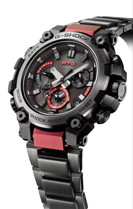 メタル素材とG-SHOCKの起源である樹脂素材を融合して革新的な構造美を追求するMT-Gシリーズ。