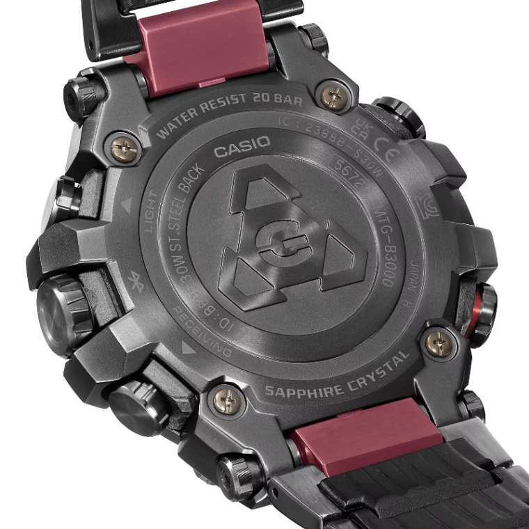 MTG-B3000はカーボン強化樹脂ケースでモジュールを保護し、外側をメタルパーツで覆った「デュアルコアガード構造」を更に進化させました。ステンレス製の裏蓋を、何工程ものプレス、切削、研磨を駆使し立体的な複雑形状に成形。バンドを固定するラグや、りゅうずガード、ボタンガードの機能を裏蓋に持たせるという全く新しい構造とデザインに挑戦し、小型薄型化も実現しています。更に工具無しでバンドの付け替えが簡単にできるワンプッシュ式交換バンド構造を新たに開発。MTG-B3000BDはステンレスとファインレジンにより軽量化したレイヤーコンポジットバンドを採用。メタルパーツにカラーIPコーティングを施し、これまでに無い新鮮なカラーリングになっています。透明度の高いサファイアガラスを採用し、カシオ山形工場の微細加工技術を用いた繊細な造形と、蒸着加工によりソーラー文字板でありながら、高い質感に仕上げています。機能面ではBluetooth®通信機能により専用アプリ「CASIO WATCHES」と接続し時刻情報を取得。マルチバンド6とタフソーラー、高輝度なLEDライトも搭載し、実用性も備えました。