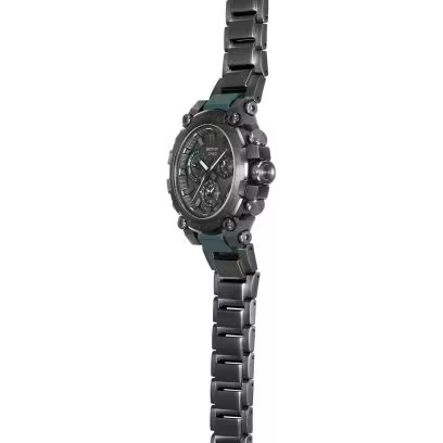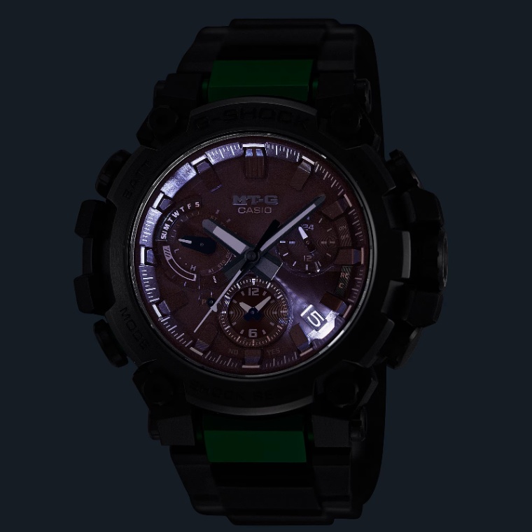 MTG-B3000はカーボン強化樹脂ケースでモジュールを保護し、外側をメタルパーツで覆った「デュアルコアガード構造」を更に進化させました。ステンレス製の裏蓋を、何工程ものプレス、切削、研磨を駆使し立体的な複雑形状に成形。バンドを固定するラグや、りゅうずガード、ボタンガードの機能を裏蓋に持たせるという全く新しい構造とデザインに挑戦し、小型薄型化も実現しています。更に工具無しでバンドの付け替えが簡単にできるワンプッシュ式交換バンド構造を新たに開発。MTG-B3000BDはステンレスとファインレジンにより軽量化したレイヤーコンポジットバンドを採用。メタルパーツにカラーIPコーティングを施し、これまでに無い新鮮なカラーリングになっています。透明度の高いサファイアガラスを採用し、カシオ山形工場の微細加工技術を用いた繊細な造形と、蒸着加工によりソーラー文字板でありながら、高い質感に仕上げています。機能面ではBluetooth®通信機能により専用アプリ「CASIO WATCHES」と接続し時刻情報を取得。マルチバンド6とタフソーラー、高輝度なLEDライトも搭載し、実用性も備えました。
