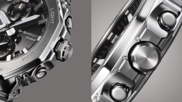 ベゼルとケースの間にファインレジン製の緩衝材を実装することで、メタル外装による耐衝撃構造を可能にしています。