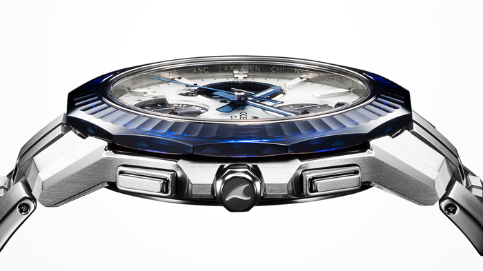 最大の特徴は、ラグジュアリーな輝きを放つサファイアガラスベゼル。12面のファセットカットと60面のコンケーブカットにより、光が複雑に屈折し、美しさを最大限に引き出します。さらに、ブルーとシルバーのグラデーション蒸着により、青空と海、そして水平線の輝きを表現。プラチナを用いたグラデーション蒸着を採用し、温かみのあるシルバーの輝きを実現しました。