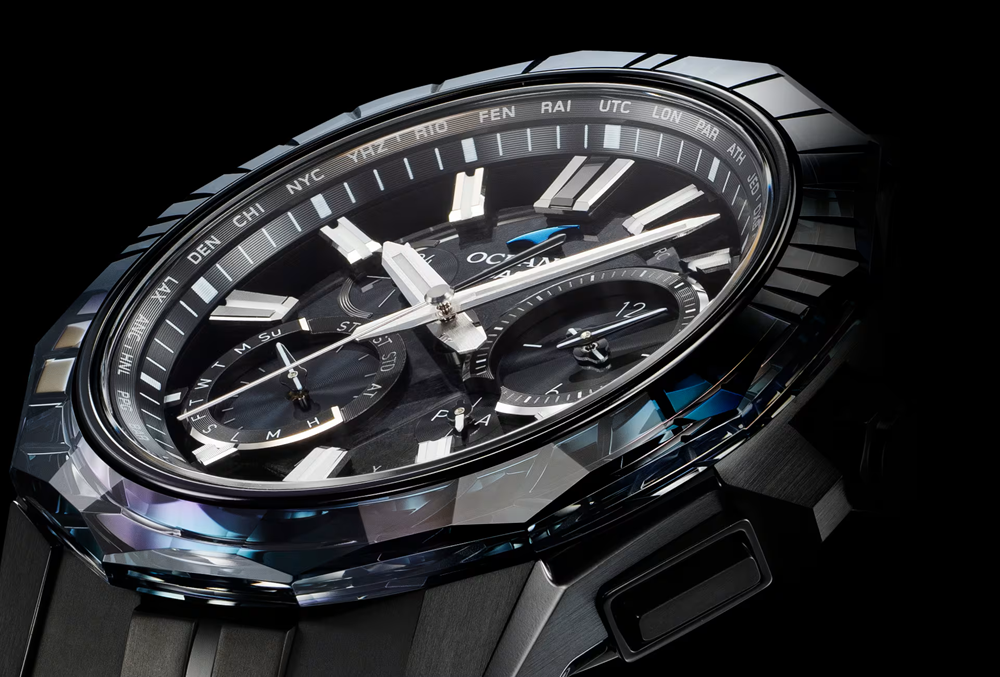 江戸切子の職人による手作業のカッティングラインのサファイアガラスベゼルが特徴です。